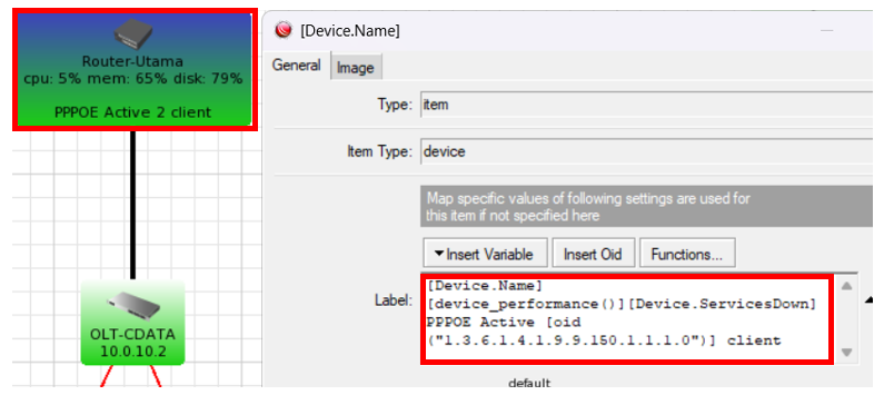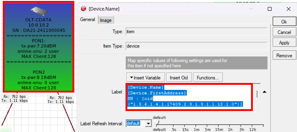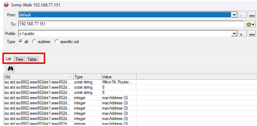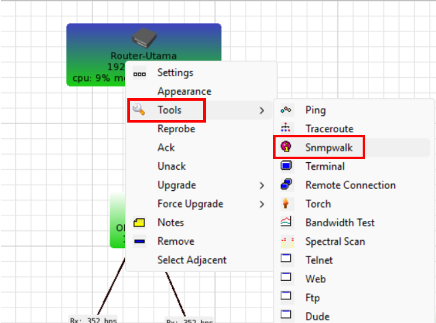 Untuk mencari OID yang diperlukan kita bisa klik kanan pada Router atau OLT, lalu kita pilih SNMPwalk, maka akan muncul list dan tree untuk mengetahui OID dari SNMP perangkat tersebut.