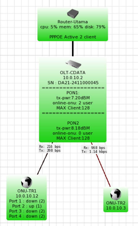 Setelah langkah monitoring OLT selesai, kita lanjut ke monitoring ONU. Untuk perangkat ONU sendiri tidak semua terdapat fitur SNMP, dan OID yang bisa dimonitoring tidak selengkap di OLTnya. Sebagai contoh saya akan memonitoring port LAN ONU berikut :