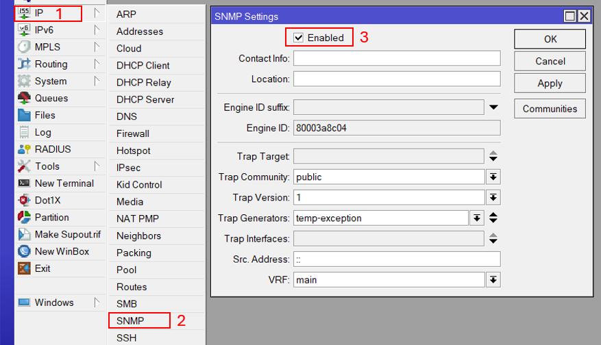 Langkah pertama kita harus menghubungkan perangkat perangkat kita ke the dude server, aktifkan SNMP pada setiap perangkat yang akan dimonitoring melalui The Dude.