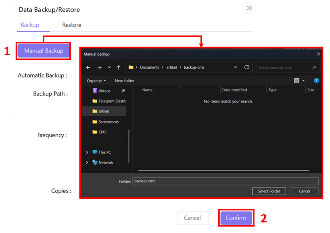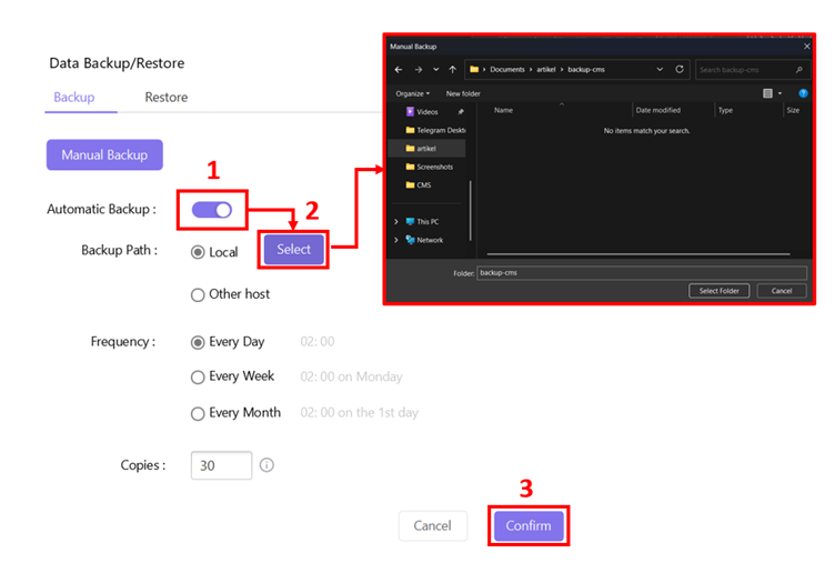 Pertama, kita bisa aktifkan otomatis backup dan memilih folder untuk menyimpan file backup. Di sini kita bisa mengatur data akan disimpan otomatis setiap hari, minggu, atau bulan. Jika sudah, klik confirm untuk menyimpan konfigurasi. Data akan tersimpan ke folder sesuai jadwal yang telah dipakai.