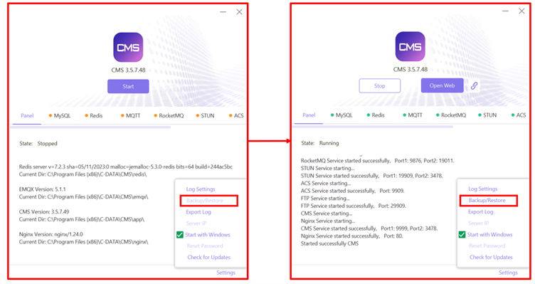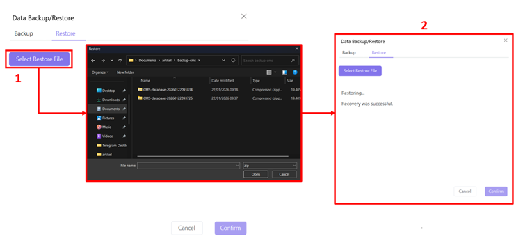 Setelah proses backup selesai, kita bisa melakukan restore data ke perangkat lain. Aktifkan terlebih dahulu CMS pada perangkat baru agar menu restore dapat digunakan.