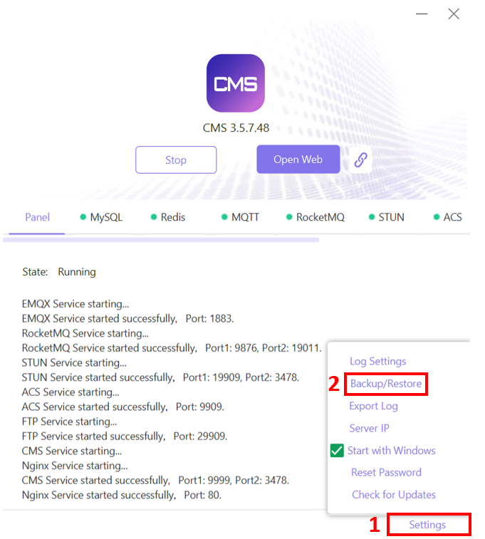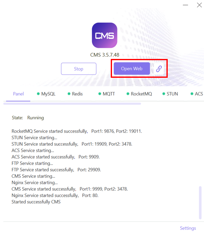 Buka dan aktifkan CMS C-DATA yang datanya akan di backup. Bisa login webfig dengan klik Open Web atau salin link dengan klik icon seperti rantai.