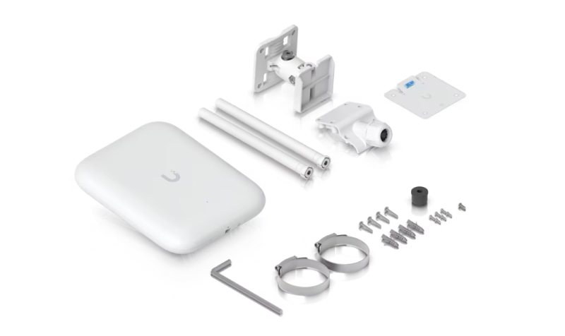 All-weather IP67 WiFi 7 AP with 6 spatial streams, extended-range AFC 6 GHz support, integrated directional super antenna, and articulation mounting bracket.