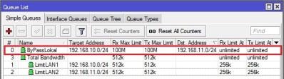 Contoh :Jika hanya dibuat Simple Queue dengan target-address : 192.168.10.0/24, traffic ke arah 192.168.11.0/24 juga akan terlimit. Agar traffic ke arah jaringan lokal lain tidak terlimit, kita bisa membuat Simple Queue baru dengan mengisikan dst-address serta tentukan Max-Limit sebesar maksimal jalur koneksi, misalnya 100Mbps. Kemudian letakkan rule tersebut pada urutan teratas (no. 0).