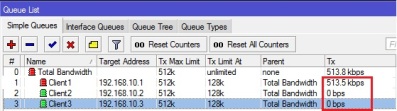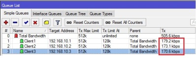 Perhitungan: Pertama Router akan memenuhi Limit-at tiap client lebih dulu, sehingga bandwidth yang digunakan 128kbps x 3 = 384kbps. Bandwidth total masih tersisa 128kbps. Sisa bandwidth akan dibagikan ke ketiga client secara merata sehingga tiap client mendapat 128kbps + (128kbps/3) = 170kbps.