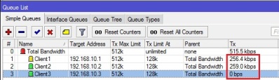 Sehingga tiap client mendapat Limit-at + (sisa bandwidth / 2) = 128kbps+128kbps