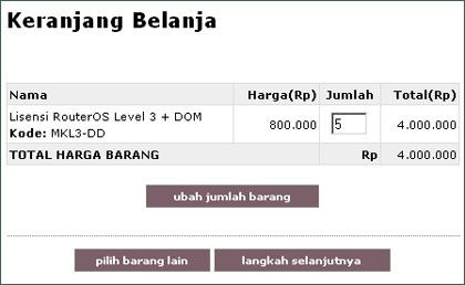 Untuk memilih barang lainnya, bisa Anda lakukan dengan memilih kategori pada kolom kiri, atau dengan menekan tombol Pilih Barang Lain. Untuk mengubah jumlah barang yang Anda pesan, ubahlan angka jumlah pada setiap barang yang Anda pesan, lalu tekan Ubah Jumlah Barang. Untuk menghapus suatu barang, ubahlah angka jumlah menjadi nol, lalu tekan tombol Ubah Jumlah Barang. Jika barang yang Anda pilih sudah cukup, tekanlah tombol Langkah Selanjutnya.