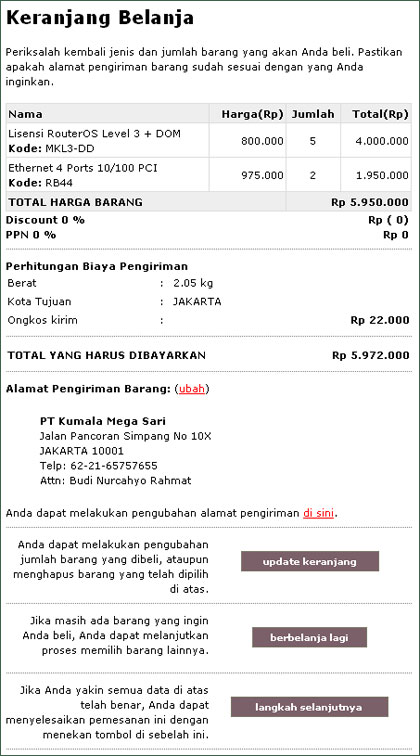 Secara default, alamat pengiriman barang Anda adalah alamat yang ada di profil Anda. Namun Anda bisa mengganti alamat pengiriman Anda, dengan menekan link "ubah" di area alamat pengiriman. Jika masih ada barang yang ingin Anda ganti, Anda bisa menekan tombol Update Keranjang. Jika semua sudah dirasakan benar, tekanlah tombol Langkah Selanjutnya.